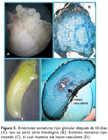 En el testigo, la respuesta a la formación de embriones somáticos fue de 0.31 ES a los 30 d, obteniéndose la máxima formación (1.7 ES) alos 90 d (Figura 4), con embriones de tipo globular que se observaron en pequeños grupos de color verde traslucidos. En el tratamiento Magenta® se obtuvo la menor cantidad de embriones somáticos formados a los 30 d con 0.16 ES en promedio, incrementándose hasta alcanzar su mayor promedio a los 120 d con 1.73 ES (Figura 4), con embriones de tipo cotiledónar en menor tiempo que el resto de los tratamientos. Estos embriones tuvieron una coloración amarillenta a los 90 d de cultivo.En la Figura 5 se muestran embriones somáticos globulares y un embrión somático tipo torpedo y sus cortes histológicos.