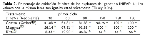 Todos los tratamientos presentaron diferentes porcentajes de oxidación a partir del primer mes decultivo. El tratamiento en sistema Rita® mostró el porcentaje más bajo de oxidación durante todo el experimento (Tabla 2). A los 180 d de cultivo, el tratamiento presentó en 56 % de oxidación de tejido siendo superior estadísticamente a los tratamientos en recipientes Gerber y Magenta®. La aparición de pequeños puntos cafés fue un indicador del comienzo oxidativo. Los explantes establecidosen el tratamiento testigo se oxidaron por completo a los 150 d, mientras que en el recipienta Magenta® la oxidación total se presentó a los 120 d.