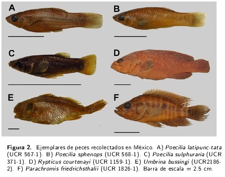 6) Poecilia latipinna (Lesueur 1821) (Figura 1F). Número de catálogo: UCR 569-1 (ex ENCB 1220), seis ejemplares (70.11 a 109.76 mm LT; 53.22 a 87.44 mm LP); localidad de captura: río Tacotalpa, Jalapa, Tabasco, México. Recolector: T. Álvarez et al. fecha de recolecta 26 de mayo de 1969.