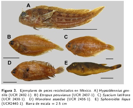 Se reportan las especies ícticas recolectadas en territorio mexicano, depositadas en el Museo de Zoología de la Universidad de Costa Rica (UCR). Esta colección consta de 23 lotes y 178 especímenes, que representan 17 especies, 14 géneros, 11 familias y 6 órdenes. Se incluyen 9 paratipos, en 3 lotes; dos especímenes de Rypticus courtenayi (Serranidae) y siete especímenes, en 2 lotes de la especie Sphoeroides lispus (Tetraodontidae), endémicas de México. Se presentan datos de referencia para cada lote (localidad, recolector, fecha, número de especímenes y ámbito de tallas) así como fotografías de las especies.