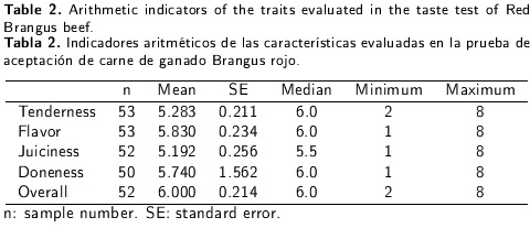 Hence, the objective of this study was to estimate the tenderness of Red Brangus cattle meat following the Warner Bratzler Shear Force method, using theoretical criteria and the hedonic preference level of the evaluated beef in a survey carried out in northern Mexico.