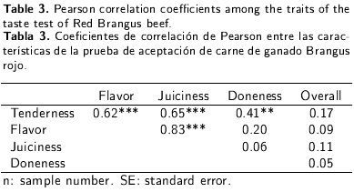 The tasting tests mean grades given for tenderness, flavor and juiciness were similar and slightly lower than the overall perception of quality (Table 2). The significant (p < 0.001) and moderately high correlation (r 0.60) obtained for the three traits evaluated (tenderness, juiciness and flavor), and the high correlation between flavor and juiciness (r = 0.83) (Table 3), are remarkable. Nonetheless, the overall grade and the other evaluated traits presented low correlations (p > 0.05).