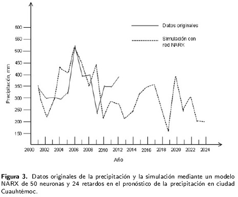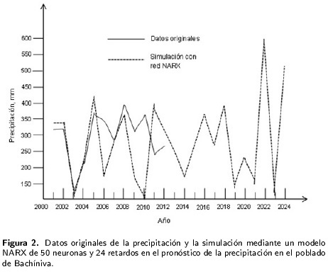 Para la localidad de Bachíniva, se obtuvo el modelo ARIMA (011)(111)27 con CME igual a 3 187, que corresponde a un error de predicción de 56.45 mm. Analizando la secuencia en serie de tiempo, se observó que para el 2019, se presentará una precipitación de 140 mm. En el análisis mediante redes NARX, el modelo con 50 neuronas y 24 retardos presentó un CME igual a 5.54, que corresponde a un error de predicción 2.35 mm. En la Figura 2 se observa un descenso en la precipitación alrededor de los 70 mm para el 2019 y de 94 mm para el 2021.