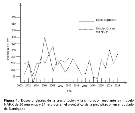Para el poblado de Namiquipa se obtuvo el modelo ARIMA (011)(111)27 con CME de 1 843, lo cual corresponde a un error de predicción de 42.93 mm. En la secuencia en serie de tiempo, se observa que para el 2018 se presentará una precipitación cercana a los 160 mm, mientras que para el 2021 será de 177 mm. Con las redes NARX se logró un modelo de 50 neuronas y 24 retardos con un CME de 36.15, que corresponde a un error de predicción de 6.01 mm. En la Figura 4 se nota un descenso en la precipitación menor de 200 mm para el 2018 y 2019. En el poblado Abraham González en el 2019 ocurrirá el próximo evento de sequía (Tabla 1). Mientras que en el poblado de Bachíniva se pronostica que el próximo evento de sequía ocurrirá en el 2019. En tanto que en ciudad Cuauhtémoc el modelo ARIMA pronostica la próxima sequía para el 2020, mientras que mediante redes NARX la sequía se pronostica para el 2019. En tanto que para el poblado de Namiquipa se pronostica la sequía para el 2018.