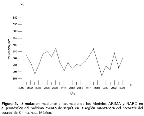 En la Figura 5 se presenta la gráfica del promedio de los modelos, con el propósito de inferir cuál será el mejor pronóstico del próximo evento de sequía en la región noroeste del estado de Chihuahua. De acuerdo con estos resultados, se espera un evento de sequía que inicié en el 2019 y terminé en el 2021, con una precipitación menor de 250 mm.