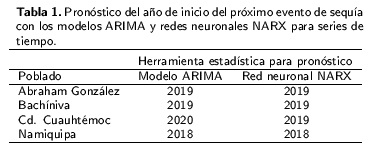 En el 2011 se presentó una de las sequías más devastadoras en el norte de México que afectó de forma negativa las actividades del sector productivo. Por lo anterior, el objetivo del presente trabajo fue pronosticar el próximo evento de sequía en el noroeste del estado de Chihuahua, México. Se utilizó información de 40 años de cuatro estaciones meteorológicas. Se empleó el modelo ARIMA con estacionalidad de nueve años, y redes neuronales artificiales con 50 neuronas y 24 retardos. Se simuló la precipitación del 2000 al 2012 y se pronosticó del 2013 al 2024. Para la estación Abraham González se pronostica que para el 2019 y 2022 se presentará una precipitación menor a 200 mm. En tanto que en la estación Bachíniva para el 2019 se presentará una precipitación de 140 mm. Mientras que en la estación Cuauhtémoc se pronostica que para el 2020 se presente una precipitación de alrededor de 200 mm. Por su parte en la estación Namiquipa, se pronostica una precipitación cercana a los 160 mm para el 2018. Se concluye que entre el 2018 y 2019, ocurrirá una sequía de moderada a severa en la región noroeste del estado de Chihuahua.