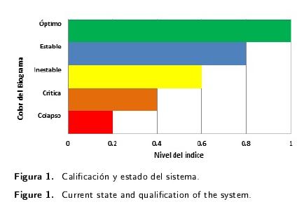 Dónde: x = es el valor correspondiente del indicador en cada dimensión evaluada del 2009 al 2012; m = es el valor mínimo del indicador y M = es el valor máximo del indicado, ambas durante el periodo de tiempo evaluado. Mediante la utilización de estas fórmulas se obtuvieron índices para cada indicador, que denotan el estado actual del sistema, el cual fluctúa entre 0 y 1, donde 1 representa la mejor situación (Óptimo/Sustentable) y 0 la peor (Colapso/No Sustentable), estos valores que se obtienen pueden ser comparados entre sí (Figura 1). Para estimar el nivel de desarrollo sostenible se utilizó un biograma, el cual es una gráfica multidimensional de representación cuyo significado se basa en el concepto de imagen del estado de un s3 (forma numérica), los cuales permiten representar el grado de desempeño del sistema utilizando para ello los indicadores de la dimensión social, económica y ambiental.