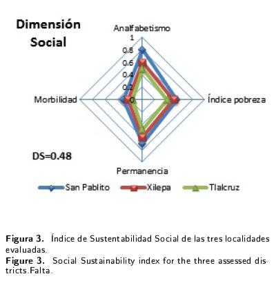 En lo que respecta a la permanencia de los campesinos en sus agroecosistemas, la situación se considera como positiva desde el punto de vista de la sustentabilidad, ya que los productores adquieren el sentido de pertenencia a sus localidades y, en consecuencia, el interés por incrementar su desarrollo a través del manejo de sus tierras; además de incrementar el arraigo familiar del hogar en cada una de las localidades. Las condiciones insalubres en las que se observó que habita la población las expone a todo tipo de enfermedades que surgen de las carencias de alimentación, la inexistencia de drenajes y la presencia de agua estancada y contaminada, motivo por el cual las enfermedades más frecuentes (morbilidad) están representadas por gripe, diarrea y dengue, en San Pablito y Xilepa; y para el caso de Tlalcruz por gripe, diarrea, dengue y neumonía, a pesar que en las tres localidades se desarrollan periódicamente jornadas médicas de vacunación organizadas por la Secretaría de Salud, así como consultas generales a los adultos; cabe recalcar que estas enfermedades resultan reiterativas, más que por descuidos o por las condiciones del clima, son producto de un trasfondo de política excluyente en el que el país mantiene a la población rural. La pobreza extrema que caracteriza a la población evaluada es el resultado de la falta de apoyos para el desarrollo agrícola sustentable de los agroecosistemas y del desconocimiento de tecnologías que mejoren la productividad de la tierra (CONEVAL 2011), por lo que la mayoría de los productores se dedican a la agricultura de subsistencia o a la siembra de un sólo cultivo, bajo este esquema de producción los rendimientos son bajos, encontrándose entre 800 y 1,000 kg ha-1 para el caso del maíz, el cual es el principal cultivo de las localidades evaluadas, según las entrevistas realizadas, mientras que el rendimiento promedio nacional se mantuvo en 3.2 t ha-1 en el 2011(Castelán et al. 2007, Financiera Rural 2011) . Consecuentemente el desarrollo rural sustentable está restringido en la zona, hecho que impide el progreso de la población, ya que éste puede servir como instrumento para aliviar la pobreza al incrementar la producción y productividad con base a los recursos disponibles. Esta situación pone en peligro la sustentabilidad social no sólo a nivel municipal sino regional, ya que la migración de productores hacia las ciudades para emplearse en actividades mejor remuneradas va en aumento (15 %). Al relacionar matemáticamente los indicadores de esta dimensión, se encontró que el índice de sustentabilidad social es de 0.48 (Figura 3), lo que representa una situación del sistema inestable pero mejorable de las comunidades (Sepúlveda et al. 1998). Esto a su vez sugiere que es necesario intervenir a través de la aplicación de programas de desarrollo social orientados hacia el mejoramiento de las condiciones de vida de la población que habita en esta región, puesto que sus respectivos índices de sustentabilidad social son similares. De lo contrario, es evidente pensar que su permanencia en el tiempo está seriamente comprometida, por la consecuente emigración de sus habitantes y venta de sus parcelas para lograr mejores condiciones de vida. Al comparar las tres localidades, se observó que San Pablito presenta la mayor sustentabilidad social (0.59), seguida de Xilepa (0.48) y Tlalcruz (0.38).