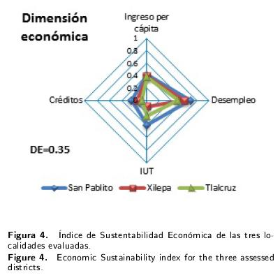 Contradictoriamente al potencial del sector agrícola, el desempleo es la constante en la región, hecho que favorece el incremento de indicadores como la pobreza y marginación, ya que la población no posee fuentes de ingreso estables que le permitan satisfacer sus necesidades básicas, a esto se suma el hecho de que el ingreso per cápita es muy bajo, y por lo tanto, los campesinos no cuentan con el suficiente ingreso para realizar un uso y manejo óptimos y sustentables de sus unidades de trabajo, motivo que ha llevado a que las zonas agrícolas se encuentren subutilizadas, por lo que se necesitan llevar a cabo programas de apoyo al desarrollo rural sustentable, que tomen en cuenta los recursos disponibles y el impacto ecológico que ocasionaría el incrementar la superficie sembrada. Desde el punto de vista de la sustentabilidad económica, estos índices bajos de utilización de la tierra representan una situación que favorece directamente la migración, ya que al no producir lo suficiente, los ingresos obtenidos son menores, y por consiguiente, se hace necesaria la búsqueda de otras fuentes de ingresos más competitivas. La falta de acceso a créditos por parte de los campesinos se suma a todos los limitantes identificados para el desarrollo económico de la zona de estudio (González et al. 2006). Al relacionar los indicadores de esta dimensión se obtuvo un índice de sustentabilidad de 0.35 (Figura 4), lo que representa un estado del sistema crítico (Sepúlveda et al. 1998). El valor más bajo fue para Tlalcruz (0.30), seguido de Xilepa (0.31) y San Pablito (0.44).