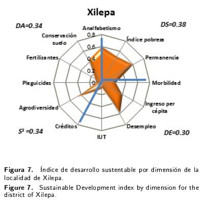 Al determinar el Índice de Desarrollo Sustentable (s3) se evidenció que Tlalcruz (0.34) y Xilepa (0.40) se encuentran en una situación crítica, por lo que la permanencia de éstas se encuentra seriamente comprometida. San Pablito (0.52) se sitúa en mejor posición, en un estado inestable, sin embargo, de igual forma mantienen seriamente comprometida su sustentabilidad (Figuras 6, 7 y 8). Estas diferencias encontradas en el índice están influenciadas por la baja permanencia de los productores en las localidades de Xilepa y Tlalcruz, ya que migran a estados o municipios aledaños e incluso a otros países para conseguir un mejor ingreso, abandonando sus tierras por largos periodos; San Pablito es quien presenta la mayor permanencia, ya que una alternativa económica y tradicional con la que cuenta es la elaboración de papel amate, además de ser la localidad que recibe mayor apoyo de créditos, hecho que se refleja al ser la localidad con mayor uso de fertilizantes químicos, además de aplicar el mayor número de medidas de conservación de suelo como algunas barreras vivas de maguey.