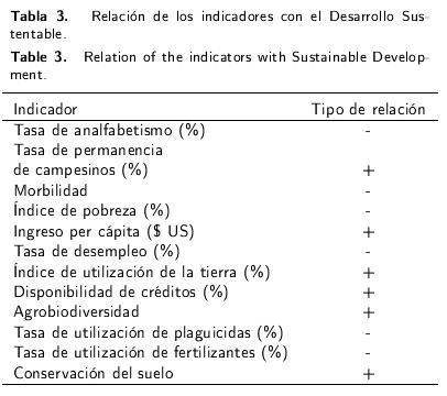 En la Tabla 3, se muestra el tipo de relación (positiva/negativa) de los indicadores evaluados con respecto a la sustentabilidad. El índice de desarrollo sustentable (s3) se estimó utilizando la metodología de Sepúlveda et al. (1998), que plantean la adaptación a una escala de medición común de los indicadores propuestos, utilizando la función de relativización planteada por el Programa de las Naciones Unidas para el Desarrollo (PNUD) para calcular el índice de Desarrollo Humano (IDH). Para el caso en que los indicadores presentan una relación positiva, se adoptó la siguiente fórmula: