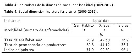 En la Tabla 4, se presentan los resultados de los indicadores de la dimensión social considerados en las entrevistas realizadas a los productores de los agroecosistemas evaluados, pudiéndose observar que el promedio de analfabetismo en la población mayor de 15 años, de las tres localidades es del 33.5 %, este valor supera significativamente la tasa estatal (11 %) y nacional (8 %), se encontró además que el analfabetismo es mayor en la población femenina que en la masculina (21.2 % y 12.3 %, respectivamente), a su vez este porcentaje de la población cuentan con poca especialización de mano de obra, e incluso, en algunos casos, no hablan español. El porcentaje de permanencia de la población fue de 59.8 % en San Pablito, 44.12 % en Xilepa y, en menor porcentaje en Tlalcruz (33.7 %). Las entrevistas realizadas, revelan que la pobreza y marginación de la población se expresan también en otros indicadores, como los de salud, ya que la desigualdad y exclusión social en este ámbito, han llevado al aumento y reiteración de enfermedades, y muerte entre la población de los agroecosistemas, de tal manera que son tres las principales enfermedades que se presentan en San Pablito y Xilepa, las cuales se corresponden con el número promedio anual a nivel nacional; y en Tlalcruz, se presentan cuatro. En promedio 89 % de los hogares de los agroecosistemas de las tres localidades, presentan ingresos mensuales menores al costo de la canasta básica, el cuál fue de $ U.S. 44 por persona/mes en el 2010. Este nivel de pobreza es superior a los niveles reportados para el país (18.2 %) y en el estado de Puebla (26.7 %).