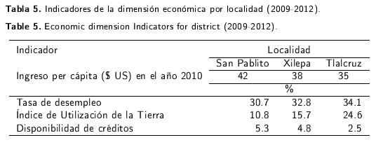 En la Tabla 5, se puede observar que el ingreso per cápita se ubicó en $ U.S. 42, 38 y 35 mensuales para los habitantes de las localidades de San Pablito, Xilepa y Tlalcruz, respectivamente. Se encontró que más del 32.5 % de la población entre 15 y 65 años de edad está desocupada. El índice de utilización de la tierra se calculó en 10.8, 15.7 y 24.6 %, para San Pablito, Xilepa y Tlalcruz, respectivamente; el porcentaje restante corresponde a tierras no dedicadas a la agricultura. En cuanto a la disponibilidad de créditos, los resultados indican que un porcentaje promedio muy bajo (4.2 %) de los productores dispone de créditos para desarrollar sus agroecosistemas.