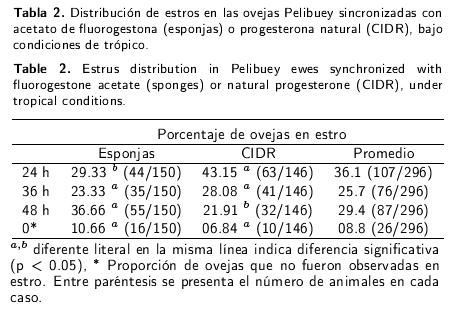 Por otra parte, en el presente estudio se observó que las ovejas que fueron sincronizadas con CIDR, exhibieron conducta estral más temprano que las ovejas sincronizadas con esponjas, estas últimas presentaron el estro en mayor proporción a las 48 h. Esta tardía respuesta al estro en las ovejas con esponjas posiblemente se deba a que los residuos de los progestágenos sintéticos (de las esponjas) tarden más en ser eliminados del organismo de las ovejas, por lo que las ovejas tratadas con esponjas presentan el estro más tardíamente (Menegatos et al. 2003).
