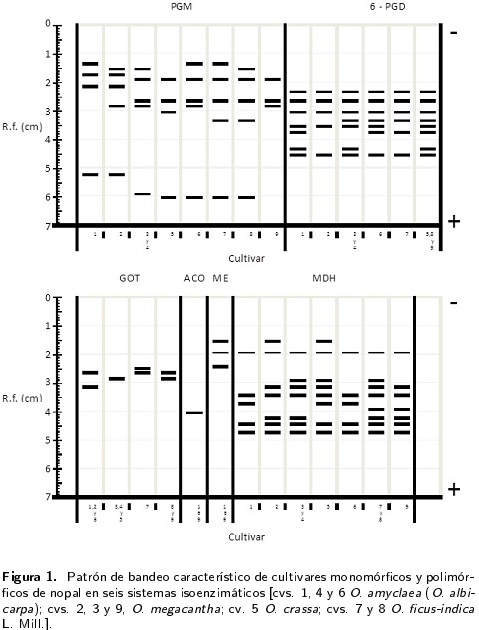 En nopal, el análisis de isoenzimas se utiliza para su clasificación taxonómica, a la vez que puede ampliar y complementar la descripción varietal de la especie. Además, las isoenzimas son marcadores ideales debido a que son colineales con el gen, por lo común codominante en efecto y poco afectadas por el ambiente. El fortalecimiento de la caracterización del nopal con herramientas alternativas, permite conocer de forma más eficiente la diversidad genética existente, apoyar su ubicación taxonómica, contribuir en programas de mejoramiento genético para la creación de nuevas variedades, así como enriquecer los bancos de germoplasma (Chessa et al. 1997), en este caso del nopal, el cual es reconocido por su importancia como recurso natural, pues colecciones de valor comercial o agronómico que se describen desde un punto de vista morfológico y antropocéntrico se protegen en bancos de germo-plasma (Bellon et al. 2009). En este sentido, el objetivo del presente trabajo fue detectar polimorfismo en nueve cultivares de nopal caracterizados por producir brotes (nopalito) y frutas (tuna) de interés comercial de las especies O. amyclaea Ten. (O. albicarpa), O. megacantha, O. crassa y O. ficusindica (L.) Mili.