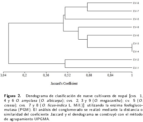 El análisis de las especies en estudio mostró que la similitud en el patrón isoenzimático de los cultivares ubicados en una sola especie fue inexistente en los sistemas PGM, 6-PGD y MDH (Figura 1), es decir, en la misma especie se presentan diferencias en su patrón de bandeo (polimorfismo). El dendograma de la isoenzima PGM (Figura 2) muestra dos ramificaciones, la primera, representada por los cultivares 1 y 2, clasificados como O. amyclaea y O. megacantha, respectivamente. La segunda ramificación se subdivide en cinco grupos; el primero agrupa a los cultivares 7 y 8, los cuales corresponden a la misma especie (O. ficus-indica); en el segundo se mantiene independiente el cultivar 5 (O. crassa); en el tercero y cuarto grupo se encuentran los cultivares 6 (O. amyclaea) y 9 (O. megacantha) como independientes; mientras que en el grupo cinco se ubican los cultivares 3 y 4 que corresponden a O. megacantha y O. amyclaea, respectivamente.