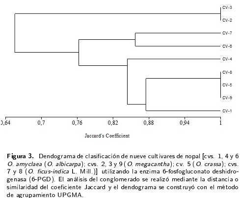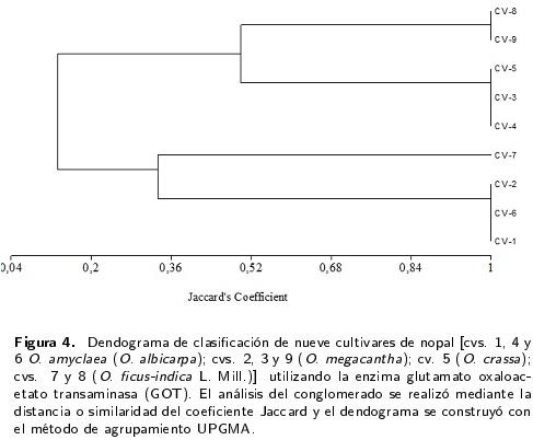 El dendograma formado por la enzima 6-PGD (Figura 3) muestra dos ramificaciones; la primera por los cultivares 2 y 3, ambos clasificados como O. megacantha. En la segunda ramificación aparecen cuatro grupos; el primero por los cultivares 6 (O. amyclaea) y 7 (O. ficus-indica)] el segundo por el cultivar 4(0. amyclaea) como independiente; el tercero formado por los cultivares 5 (O. crassa), 8 (O. ficus-indica) y 9 (O. megacantha). El cultivar 1 (O. amyclaea) aparece en el cuarto grupo de forma independiente. El dendograma de la enzima GOT (Figura 4) presentó dos ramificaciones, ambas con dos grupos. En el primer grupo con los cultivares 1 y 6 (O. amyclaea) y 2 (O. megacantha) y en un segundo con el cultivar 7 (O. ficus-indica) como independiente. La segunda ramificación mostró un primer grupo con los cultivares 3 (O. megacantha), 4 (O. amyclaea) y 5 (O. crassa) y un segundo con los cultivares 8 (O. ficus-indica) y 9 (O. megacantha).