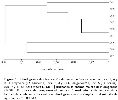 El dendograma de la enzima MDH (Figura 5) presentó dos ramificaciones principales. La primera que se subdivide en dos grupos, en el primero se agruparon los cultivares 1 y 6 (O. amyclaea) y en el segundo el cultivar 5 (O. crassa) como independiente. La segunda ramificación se subdivide en cuatro grupos, el primero formado por los cultivares 3 (O. megacantha) y 4 (O. amyclaea), el segundo por los cultivares 7 y 8, ambos de O. ficus-indica, el tercero formado por el cultivar 9 (O. megacantha) y el cuarto por el cultivar 2 (O. megacantha).