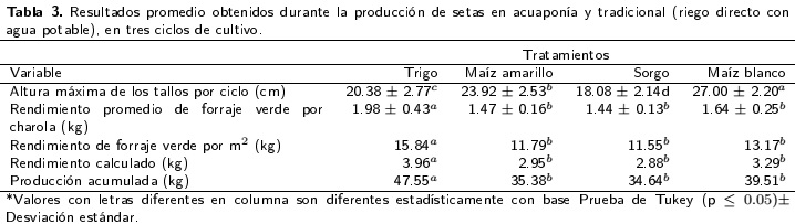 Experimento 2. Durante el germinado y cultivo de los diferentes forrajes evaluados, se observó un crecimiento constante, aunque algunos autores indican que para producir forraje verde de trigo, avena y cebada se requieren temperaturas entre 18 y 21 °C, mientras que el forraje de maíz necesita temperaturas de 25 a 28 °C (López-Aguilar et al. 2009, Rivera et al. 2010). Al respecto Vargas-Rodríguez (2008) señala que se puede tener un buen rendimiento de forraje, aun cuando el cultivo esté fuera de los valores ambientales recomendados, siempre que se cubran sus requerimientos de nutrientes. No se encontraron diferencias de crecimiento y de producción entre especie, lo que puede estar relacionado con las tasas de crecimiento de cada gramínea, su origen o variedad (Rivera et al., 2010) como se observa en las diferencias entre el maíz blanco y amarillo. El sorgo fue el forraje con la mayor producción total, mientras que el maíz blanco tuvo la mayor altura de tallo, con valores similares a los que obtuvo Vargas-Rodríguez (2008), lo que sugiere que el agua del sistema acuícola cubrió las necesidades nutricionales de las plantas.