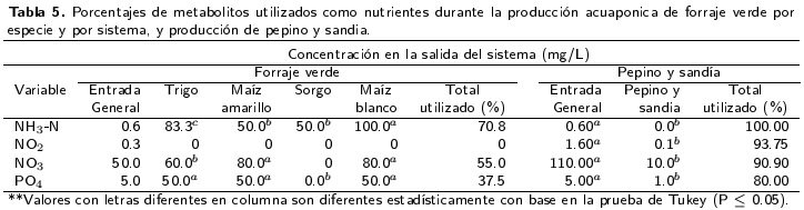 Los nitritos se mantuvieron constantes después de pasar por el sistema acuapónico en todos los tratamientos de forraje. La absorción de los fosfatos varió en los forrajes, teniendo el trigo, maíz amarillo y blanco una absorción de 50 %. Las plantas de pepino y sandía aprovecharon el 100 % de amonio, mientras que sólo el 93.73 % de nitritos y 90.9 % de nitratos (Tabla 5b). En general, el pH del agua del sistema acuícola tuvo un valor promedio de 8.2; después de pasar por los sistemas acuapónicos para todos los cultivos, disminuyó a 7.9.