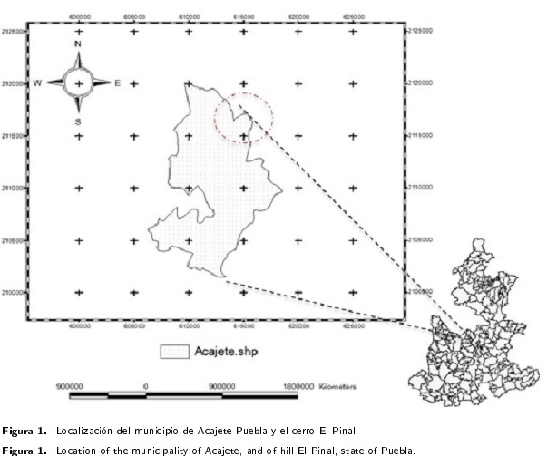 La recolección de macromicetos silvestres comestibles se realizó en el cerro El Piñal, ubicado en el municipio de Acajete, Puebla, que se localiza entre los 19° 00' y 19° 12' LN, y los 97° 50’ y 98° 01' de LO; a una altitud de entre 2 280 y 3 200 msnm. Colinda al norte con el municipio de Tepatlaxco de Hidalgo, parte del estado de Tlaxcala y el municipio de Nopalucan; al este con los municipios de Nopalu-can y Tepeaca; al sur con los municipios de Tepeaca, Cuautinchán y Amozoc; al oeste con los municipios de Amozoc y Tepatlaxco de Hidalgo (Figura 1). Presenta un clima templado subhúmedo con lluvias en verano C(w2), y temperatura media entre 6 y 16 °C, precipitación pluvial media anual de 772.3 mm y área boscosa de 2 190 ha (INEGI 2009).