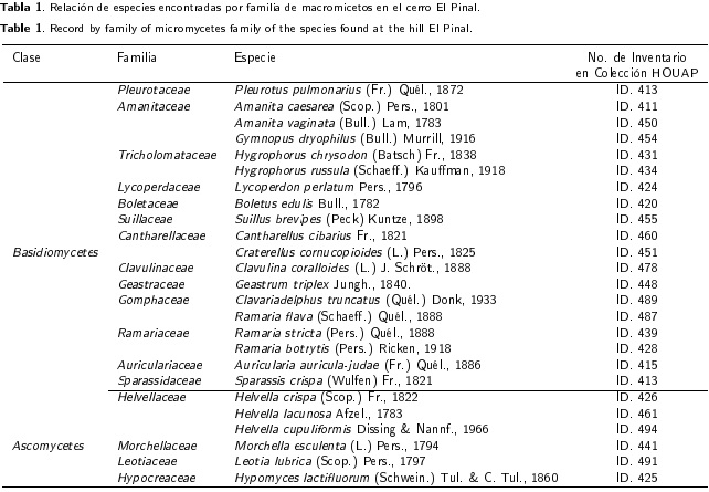 Se recolectaron 86 especímenes de basidio-carpos de hongos silvestres, de los cuales 25 especies se identificaron como hongos comestibles, pertenecientes a 2 clases, 8 órdenes, 17 familias y 19 géneros. De las 25 especies identificadas, 19 pertenecen a los Basidiomycetes y 6 a los Ascomycetes. Las familias presentes de la clase Basidiomycetes fueron: Pleuroteaceae, Amanitaceae, Tricholomataceae, Lycoperdaceae, Boletaceae, Suillaceae, Cantharellaceae, Clavulinaceae, Geastraceae, Gomphaceae, Ramariaceae, Auriculariaceae y Sparassidaceae; mientras que las familias pertenecientes a la clase Ascomycetes fueron: Helvellaceae, Pezizaceae, Morchellaceae, Leotiaceae e Hypocreaceae (Tabla 1).