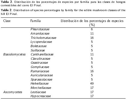 La proporción de familias dentro de la clase Basidiomycetes (Tabla 2), muestra en primer lugar a la familia Ramariaceae y Tricholomataceae, ambas con 16 % seguido de Amanitaceae y Cantharellaceae con el 11 %, tan solo estas cuatro familias abarcan 54 % del total de especies encontradas para la clase Basidiomycetes; mientras que para la clase Ascomycetes, la familia mejor representada fue Helvellaceae con 50 % del total de las especies, todas las demás familias ocupan un porcentaje inferior.