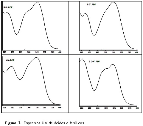 Para la determinación de fenoles totales se tomaron 15 µL de extracto, se agregaron 240 µL de agua destilada y 15 µL del reactivo Folin-Ciocalteu. Después de 5 min se agregaron 30 µL de Na2CO3 al 7 %, la solución se agitó durante 30 s, para luego llevar la reacción en oscuridad por 90 min, posteriormente se midió la absorbancia de las muestras a 750 nm. La concentración se obtuvo usando la ecuación de regresión lineal de la curva de calibración establecida con ácido ferúlico en concentraciones de 0 a 200 mg L-1, el resultado se expresó en micro-gramos equivalentes de ácido ferúlico por gramo de muestra (µgEAF g-1). La cuantificación de ácidos fenólicos se llevó a cabo en un HPLC Varian ProStar equipado con detector UV-Vis con arreglo de diodos ProStar 330 y bomba terciaria ProStar 230 (Wallnut Creek, CA, USA), de acuerdo con Whitaker y Stom-mel (2003), utilizando una columna analítica Phe-nomenex Luna C18 (4.6 x 250mm, 5µ) (Torrence, CA, USA) con un gradiente de fase móvil binaria compuesta por metanol y acido fosfórico al 0.01 % y un volumen de inyección de 20 µL de muestra. La concentración de las muestras se obtuvo usando la ecuación de regresión lineal de las curvas de calibración obtenidas con los ácidos ferúlico, cumárico, cafeico y sinápico (Sigma-Aldrich, St. Louis, MO, USA) en concentraciones de 0 a 200 mg L-1, el resultado se expresó en microgramos equivalentes de cada ácido fenólico por gramo de muestra (µg g-1). La identificación de los ácidos diferúlicos se llevó a cabo por medio de un barrido del espectro UV (200 a 400 nm) en los compuestos desconocidos de los cromatogramas y se compararon con los espectros UV de ácidos diferúlicos reportados por Waldron et al. (1996) y Dobberstein y Bunzel (2010).