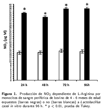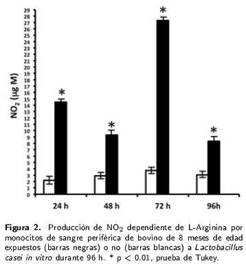 Por otro lado, el óxido nítrico (ON) es un no radical libre sintetizado a partir de L-arginina por mtres diferentes sintasas-ON (ONS) que exhibe múltiples y complejas funciones biológicas y muchos de sus efectos pueden ser atribuidos principalmente a su potente capacidad oxidativa (Pavenelliy Nogueira 2010). Se sabe que el ON puede modular directa e indirectamente la respuesta inmunitaria por medio de diversos mecanismos tales como el me- usdiar efectos microbicidas de radicales libres derivados del ON, principalmente dentro de macrófagos y otros fagocitos (Pavenelli y Nogueira 2010). Se ha indicado que la producción de óxido nítrico por fagocitos, como los monocitos y macrófagos, es un factor importante en la protección del hospedero contra la infección de diferentes microorganismos patógenos (Fang 1997) entre los que se encuentran parásitos como Giardia (Pavanelli et al. 2010), Trypanosoma cruzi (Pavenelli y Nogueira Silva 2010) y Babesia spp. (Johnson et al. 1996, Bautista et al. 2005). En este sentido, también en investigaciones anteriores, se demostró que los monocitos de sangre periférica de bovino modifican su morfología al ser estimulados in vitro por el lactobacilo (Bautista et al. 2014); sin embargo, no se conoce si dicha bacteria activa monocitos para que produzcan ON. En este contexto, la presente investigación se llevoa cabo con el objeto de determinar la producción de ON a partir de monocitos de sangre periférica de bovino, expuestos in vitro a L. casei.