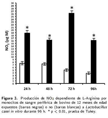 La presente investigación se llevó a cabo con el objetivo de determinar la producción de óxido nítrico (ON) a partir de monocitos de sangre periférica de bovino, expuestos in vitro a L. casei. Se midió la producción deON cada 24 h durante cuatro días, en cultivos de monocitos de sangre periférica de bovinos de 4 a 6 meses de edad(MDE) (n = 4), 8 MDE (n = 3) y 12 MDE (n = 8), expuestos (E) o no (NE) a Lactobacillus casei. En cada unode los periodos de 24 h se observó una producción significativa (p < 0.01) de ON en los monocitos expuestos encomparación con los no expuestos. La diferencia fue más marcada en los monocitos del grupo 4 a 6 MDE. El usode L. casei puede ser importante para establecer medidas de estimulación de la inmunidad innata en bovinos contraenfermedades producidas por diversos patógenos.