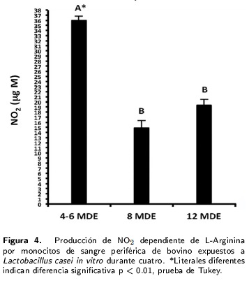 Cuando se compararon los promedios de cuatro días de ON producido por los monocitos en los tres grupos de edad, se observó que hubo una diferencia significativa (p < 0.01) en los valores obtenidos por las células de los becerros de 4-6 meses de edad en comparación con los monocitos de bovinos de ocho y 12 meses de edad (Figura 4) . Los resultados obtenidos en la presente investigación, en bovinos de tres edades, indican que L. casei (bacteria Gram positiva) indujo la producción significativa de ON en cultivos de monocitos expuestos a este lactobacilo en comparación con las células testigo no expuestas, lo que concuerda con Werling et al. (2004) quienes observaron que la producción de ON en cultivos de macrófagos expuestosa distintas bacterias Gram negativas, fue estadísticamente mayor que la producción de ON en células testigo no tratadas. Dichos resultados sugierenque los monocitos fueron activados por de receptores tipo Toll. Al respecto, se sabe que L. casei estimula la respuesta inmunitaria innata a través dela activación de TLRs y la producción de citocinastipo Th1 (Maldonado Galdeano y Perdigón 2006, Vizoso et al. 2009). Es importante resaltar que los monocitos se diferencian en macrófagos y células dendríticas cuando pasan de la circulación a los tejidos y que el bazo es el órgano de almacenamiento de los monocitos (Swirski et al. 2009), por lo 251 que estas células participan de forma activa en los mecanismos inmunitarios innatos. Los resultados de la presente investigación apoyan la idea de quela activación de la inmunidad innata por medio de agonistas de los receptores tipo Toll, como L. casei, también promueve una buena respuesta inmunitaria adaptativa (Bachmann y Jennings 2010) lo cual puede ser aprovechado en el mejoramiento de vacunas (Pashine et al. 2005). Los monocitos debecerros de 4 a 6 meses de edad produjeron una mayor cantidad de ON en comparación con los otros grupos de edad, lo que concuerda con la observación de que los becerros presentan mecanismos inmunitarios innatos superiores a los de los bovinos adultos (Goff et al. 2010).