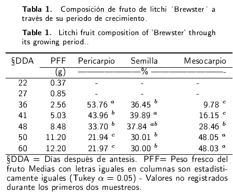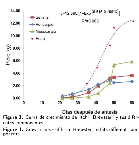 La dinámica de crecimiento del fruto del litchi fue del tipo sigmoidal; lo que significa que hay una etapa en la que se alcanza un mayor punto de crecimiento; a partir de dicho punto, el crecimiento es más ligero y constante (Vieira et al. 1996). En el caso de este fruto, este punto se registró a los 50 dda. Al respecto, Salomáo et al. (2006) reportaron un patrón de crecimiento sigmoidal en litchi "Bengal" que es similar a los registrados en el presente trabajo, aunque los datos de distribución porcentual de pericarpio, semilla y mesocarpio, sobre todo en la etapa de fruto maduro fueron diferentes; ellos mencionaron que el peso del fruto se distribuye en 37.8 % para pericarpio, 32 % a semilla y 30.2 % al mesocarpio, por lo que de acuerdo a los resultados de la presente investigación, existe una diferencia de casi 20 % en el mesocarpio entre "Brewster" y "Bengal", ya que "Brewster" puede llegar a registrar hasta 48 % con respecto al peso total del fruto.