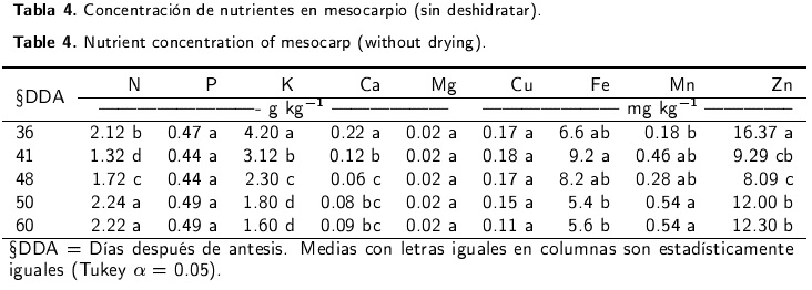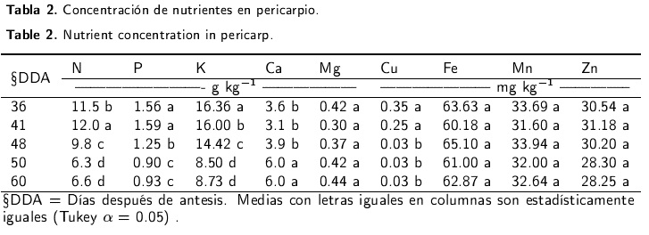 La concentración de nutrientes en pericarpio, muestra que algunos nutrimentos como el N, P, K, disminuyen conforme el fruto crece; para el caso de Ca se elevó la concentración en la etapa final de crecimiento del fruto, esta situación es producto de la concentración de este nutrimento en el suelo, ya que según el análisis de suelo, el huerto posee alta concentración de Ca (> 3000 mg kg-1), por lo que se considera como una condición de suficiencia para este nutrimento. En cuanto al Mg, Mn, Fe y Zn, no se presentaron diferencias significativas a través del periodo de crecimiento; mientras que el Cu mostró mayor contenido a los 36 y 41 dda, esto pudo deberse a la aplicación de productos fungicidas a base de Cu en el huerto (Tabla 2).