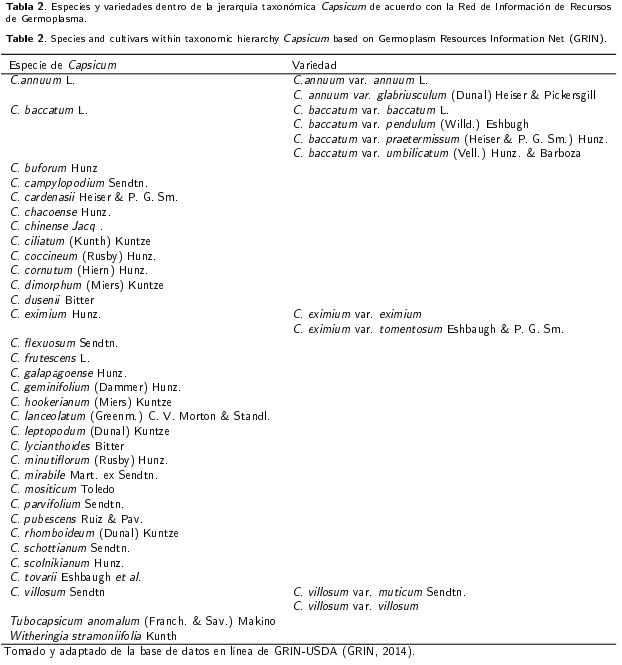 La clasificación taxonómica de Capsicum aceptada por GRIN (2014) se muestra en la Tabla 1; también indica que el género Capsicum incluye 33 especies y 10 variedades o variantes (Tabla 2). Dichas especies se han diferenciado principalmente con base en características fenotípicas como la morfología de la flor o del fruto (Latournerie et al. 2002, Pérez-Castañeda et al. 2008, Alonso et al. 2008, Castañón-Nájera et al. 2008, 2010). La especie C. annuum es la más ampliamente distribuida en México y la que presenta la variabilidad morfológica en tamaño, forma, color de frutos (Pozo et al. 1991, Baltazar 1997) y la mayor variabilidad genética (Hernández-Verdugo et al. 2001a). De las 33 especies de Capsicum, cinco se han domesticado: C. annuum L., C. baccatum L., C. chínense Jacq., C. frutescens L. y C. pubescens Ruiz Pav. (Kraft et al. 2014). Los estudios morfológicos en Capsicum se han restringido a ciertas especies, subespecies, variedades o morfotipos (Latournerie et al. 2002, Pérez-Castañeda et al. 2008, Alonso et al. 2008, Castañón-Nájera et al. 2008, 2010).