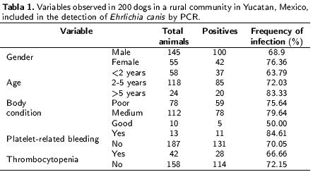 A cross-sectional study was performed to estimate the prevalence of infection of Ehrlichia canis in dogs and to explore the factors associated with the presence of the bacteria. The study was carried out in a village in Yucatan,Mexico. Blood samples were obtained from 200 dogs. Samples were analyzed by nested-PCR to detect the presenceof E. canis DNA and thrombocyte counts were calculated. One-hundred and forty of the dogs (70 %) were found tobe infested with ticks. A total of 1 116 ticks were recovered and all were identified as Rhipicephalus sanguineus. Theprevalence of E. canis infection was 69.2 %. None of the variables studied (gender, age, body condition, platelet-relatedbleeding, thrombocytopenia, and presence of ticks) showed association with E. canis infection. In conclusion, there isa high probability that dogs living in Yucatan, Mexico are infected with E canis.