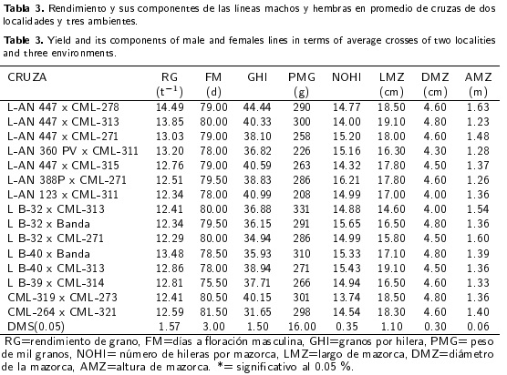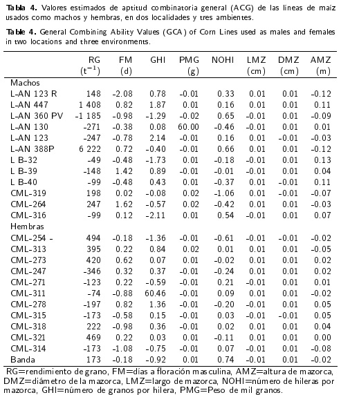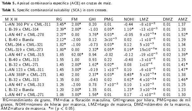 En relación a los valores de ACE de las cruzas con los mayores rendimientos de grano (Tabla 5), se observa que las cruzas L-AN 360 PV x CML-311, LB-40 x BANDA, L-AN 447 x CML-278, LB-39x CML-314, CML-319 x CML-273 y CML-264x CML-321 tuvieron efectos positivos y significativos de ACE; con excepción de las cruzas L-AN 447 x CML-278 y CML-264 x CML-321, el resto de las cruzas provienen de dos progenitores con efectos negativos de ACG. En la cruza L-AN 447 x CML-278 el potencial de rendimiento estuvo influenciado por valores positivos y significativos de las variables GHI y PMG, mientras que en la cruza CML-319 x CML-273 los mayores efectos de ACG los tuvieron las variables GHI, PMG y LMZ.