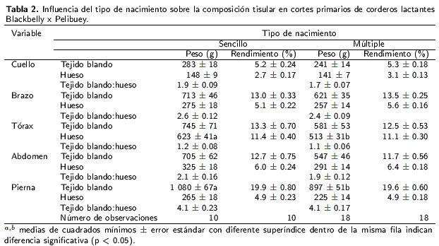 The objective of this study was to evalúate the influence of the umber of lambing of the ewe (NB) and the type of birth (TB) of suckling lambs on the tissue composition of the carcass and primal cuts. Twenty-eight Blackbelly x Pelibuey lambs were evaluated using a two-factor factorial design. The factors of the study were: primiparousand multiparous (NL), and single and twin (TB). The evaluated variables were: hot carcass weight (HCW), weight andyield of soft tissue (ST) and bone in the complete carcass. The TB influenced (p < 0.05) the HCW, ST and bone inthe carcass, weight of ST in the leg and bone in the thorax. An association was observed (p < 0.01) between the STand bone in the primal cuts with the weight of the ST and bone in the carcass. The predicting equations of the ST incarcass considered the weight of ST in arm (R2= 0.96; p < 0.01) in single lambs and weight of ST in leg (R2= 0.90; p < 0.01) in twin lambs. In conclusión, the type of birth affected the weight and tissue composition of the carcasses of Blackbelly x Pelibuey lambs. The weight of the soft tissue in the carcasses of single birth lambs was precisely estimatedwith the weight of soft tissue in the arm and with the weight of soft tissue in the leg in the case of twin.