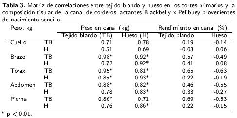 Al respecto, Luaces et al. (2008) en un estudio con corderos lechales de la raza Gallega de nacimiento sencillo, encontraron relación entre el músculo de seis cortes primarios con el músculo de la canal. Estos resultados son similares a los del presente estudio, en el sentido de que el TB en cuatro de los cinco cortes primarios tuvo relación con el TB en canal.
