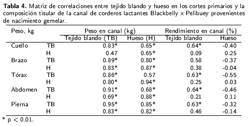 Con excepción del hueso en el cuello, el resto de las variables mostraron relación positiva con el peso del TB en la canal de corderos gemelos (p < 0.01). El peso del hueso en la canal de corderos gemelos tuvo asociación positiva con el peso del TB y hueso en los cortes primarios (p < 0.01), con ex-cepción del TB en tórax (Tabla 4). El rendimiento del TB en canal se correlacionó con todas las partes de la canal (p < 0.01), excepto con el brazo que no se correlacionó (Tabla 4). El rendimiento del hueso en la canal, no se correlacionó (p > 0.01) con ninguna de las variables estudiadas en los cortesprimarios.