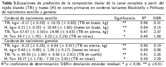 En la tabla 5 se muestran las ecuaciones para predecir el peso y rendimiento del TB y hueso en lacanal de corderos de nacimiento sencillo y gemelar. En corderos de nacimiento sencillo, la ecuación parapredecir el peso del TB en canal consideró el TBen brazo (R2 = 0.96, p < 0.01), mientras que elpeso del hueso en canal se estimó con el peso delhueso en brazo (R2 = 0.84, p < 0.01). En corderos de nacimiento gemelar, el peso de TB en canal seestimó con el peso del TB en pierna (R2 = 0.90, p < 0.05) y el peso del hueso en canal con el peso del nacimiento sencillo, el rendimiento del TB en canal se estableció con el peso del TB en pierna (R2 =0.47, p < 0.05), mientras que el rendimiento delhueso en canal se estimó con el peso del TB en tórax (R2 = 0.40, p < 0.05). En corderos de nacimiento gemelar, las ecuaciones para predecir el rendimiento de TB y hueso en canal consideran el peso del TB2 en tórax (R2 = 0.30, p < 0.05) respectivamente.