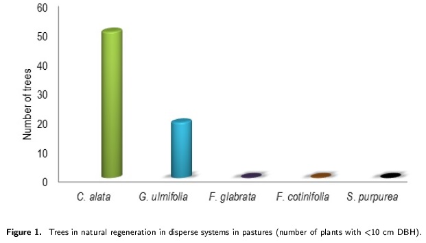 In the two silvopastoral systems, scattered trees in pastures and living fences trees, the identified species were C. alata, G. ulmifolia, C. glabrata, F. cotinifolia, and S. purpurea (Table 5). For the scattered trees, the range of diameter at breast 294(DBH) was 30.1 to 44.4 cm, and height was 6.3 to 9.5 m, while for living fence trees it was 28.9 to 117.3 cm DBH and height was 4.9 to 28.0 m (Table 5). The trees that had higher natural regeneration were C. alata and G. ulmifolia in the silvopastoral System of trees scattered in the grasslands with a DBH minor to 1 cm and a total of 50 plantlets for C. alata and 19 plantlets for G. ulmifolia, respectively (Figure 1).