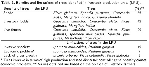 Producers have ampie knowledge of the con-sumption of tree species by their animáis; despite this, only 4 % of them mentioned having harvestedfoliage or fruits from the trees to feed their con-fined animáis. Although the trees provide foliageand fruits to feed livestock, only 26 % of the LPUplant trees to reforest and 64 % of the producersmentioned that their animáis consume foliage andfruits in the dry season during grazing. The uses oftrees in the LPU are as shadow (36 % of the surveys highlighted Ficus glabrata, Spondias purpurea, Crescentia alata, Magifera indica, and Guazuma ulmifolia by its greater crown diameter; as livestock forage (42 % of the surveys highlighted G. ulmifolia, C. alata, F. glabrata, and M. indica); and as live fences (29 % of surveys listed G. ulmifolia, C. alata, F. glabrata, Ipomoea murucoides,S. purpurea, and Mastichodendron capiri) (Table 1). Limitations of the trees were singled out asinvasive species in 19 % of the surveys, and treesthat cause economic problems in 7 % of surveysfor I. murucoides and P. guajava for being specieswith high dispersal and seed production that require control practices of their density; The 3 %of livestock farmers mentioned that Licania arborea, Ficus cotinifolia and F. glabrata decreasesthe growth of pastures under the crown diameter.The distribution system of the trees in the LPUwas established as follows: 93 % of the trees infences, 96 % trees scattered in the grasslands, 19% fruit trees, 1.4 % trees in living fences, and55 % shrubbery as part of the original vegetation.