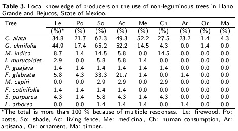 Most of the trees identified have múltiple uses and are important components of the natural vegetation in the area, with good adaptationto the local environmental conditions (Table 3).These results coincide with studies performed in other States in the country (México); in Morelos (Solares 2004), Quintana Roo (Sosa et al. 2004) , Tejeda, Veracruz (Couttolenc et al. 2005), Angostillo, Veracruz (Villa et al. 2009), Sierra of Tabasco (Grande et al. 2010), The Limón, Veracruz (Bautista et al. 2011); and in other countries, in Rio Frió, Costa Rica (Villacis et al. 2003), in the Caribbean, Colombia (Cajas and Sinclair 2001), in the Pacific, Costa Rica (Harvey and Haber 1999). This shows that the use of trees in different regions is similar; generally speaking, producers prefer to keep trees that offer more products and Services to the LPU (Esquivel et al. 2011).