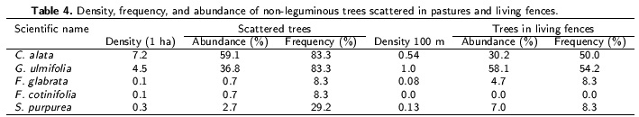 Five native species are reported to be the product of natural regeneration, with a popularon of 291 trees (24 ha) scattered in the grass-lands at a mean density of 12.2 trees ha-1. Thetrees with the highest density were C. alata and G. ulmifolia, with 7.2 and 4.5 trees per ha-1,respectively (Table 3). The most abundant andfrequent species were C. alata (59.1 and 83.3%) and G. ulmifolia (36.8 and 83.3 %), respectively. In the fences, we found 46 trees (2 400 m)with a mean density of 1.75 trees. The specieswith the highest density is G. ulmifolia, making it the most important species in the LPU (Table 4).