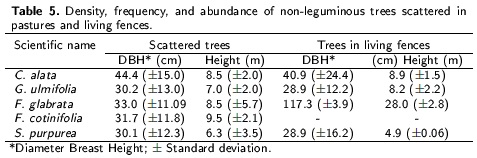 Although the study was centered around non-leguminous trees (Table 4), the density coincides with studies done in Cañas, Costa Rica (Esquivel et al. 2011) and in the State of México (Olivares-Perez et al. 2011). The low density of some trees in the grasslands and living fences may be to the result osof damage and the mortality of plantlets, caused by the livestock in the paddock, the application of herbicides, and weeding done by the producers in their regular control practices (Olivares-Perez et al. 2011, Guerreiro et al. 2015). The predominant species show characteristics that facilítate their natural regeneration, abundant seed production and the ability to be spread by livestock after consumption. These aspects are important for the natural repopulation of these species (Villacis et al. 2003). The use of trees in living fences is beginning to become more important because of their durability andthe economic saving to be made, especially in areas where the original vegetation has been disturbed by the múltiple Services provided by the trees (Olivares-Perez et al. 2011, Jiménez et al. 2015).