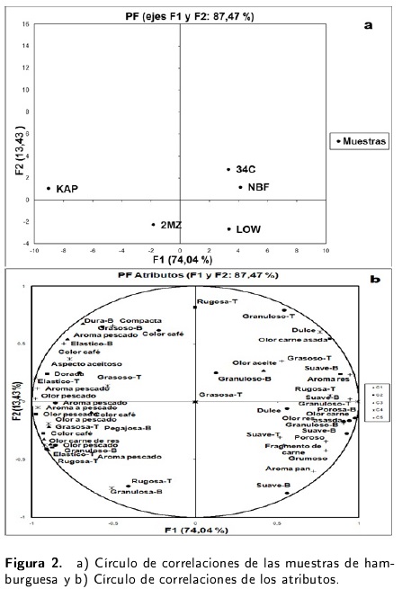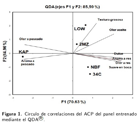 El mapa sensorial del PF (Figura 2), explica, el 87.47% de la variabilidad con los dos primeros ejes principales. Revela que las muestras NBF y 34C son un grupo, opuesto a las muestras 2MZ y LOW. Mientras que la muestra KAP se ubica alejada del resto de las muestras, la cual tiene atributos visuales (color café y aspecto aceitoso), nasal (olor a pescado) y en boca (dura, elástica y aroma a pescado). Mientras que las muestras 2MZ y LOW tienen características de textura rugosa, grumosa, olor a carne asada, suave en boca y aroma a pan. En tanto que las muestras NBF y 34C se caracterizaron por tener atributos de suave en la boca, olor a res y granuloso en boca. En lo referente al termino textura grasosa, este se ubicó en el origen de la figura, lo que indica que es un atributo típico de las muestra.